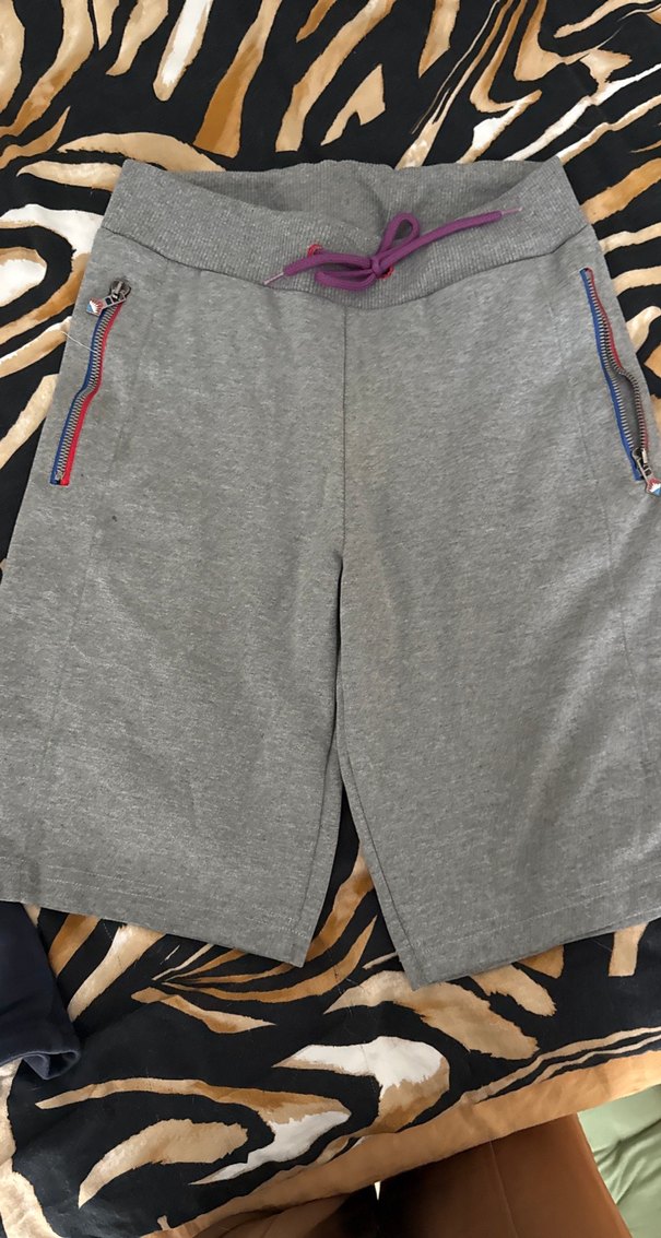 Gri renkli, fermuarlı cepleri ve mor bağcığı olan bol kesim erkek şort. Sentetik kumaştan, zebra desenli sokak stili için uygun.