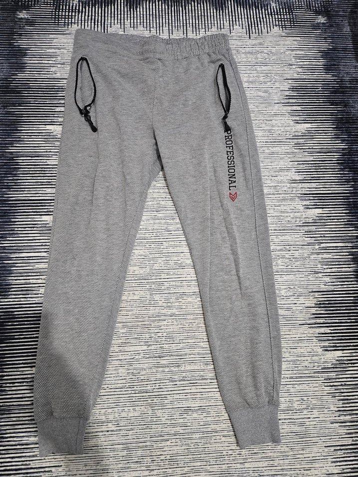Gri renk, fermuarlı cepli, sentetik kumaştan yapılmış bol kesim erkek spor eşofman altı. Yanında "PROFESSIONAL" yazısı bulunur. Spor ve günlük kullanıma uygundur. bedenini tam olarak bilmiyorum ama 80 ila 85 kg arasındaki kişiler için uygundur