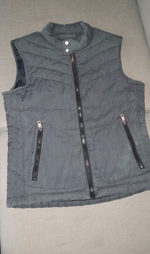 Fermuarlı, yüksek yakalı, gri renkte, normal boyda, dar kesim erkek yelek. Sokak stiline uygun, günlük kullanıma elverişli.