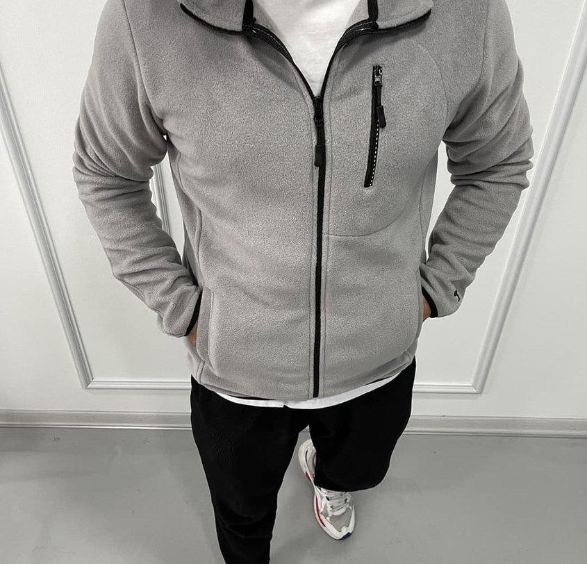 Gri renkli, fermuarlı ve göğüs cebine sahip, yumuşak kumaştan erkek sweatshirt.uzun kolludur, rahat ve şık bir görünüm sunar.