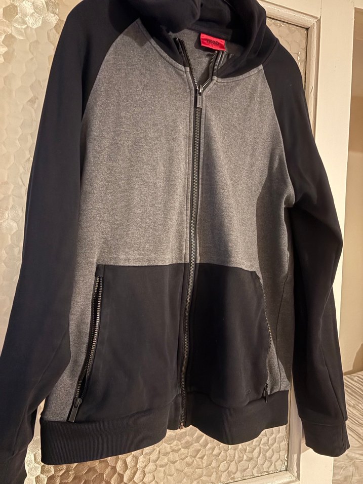 Gri ve siyah renklerde, fermuarlı, uzun kollu ve bisiklet yaka erkek sweatshirtü. Yumuşak ve sıcak kumaştan, sokak tarzı için uygundur. Üst unısex L beden hugo marka kaliteli ve kapşonlu