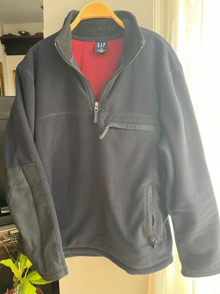 Gri renkli, yarım fermuarlı, yüksek yakalı erkek polar sweatshirt. Uzun kollu ve bol kesim, günlük ve sokak stili için uygun.
