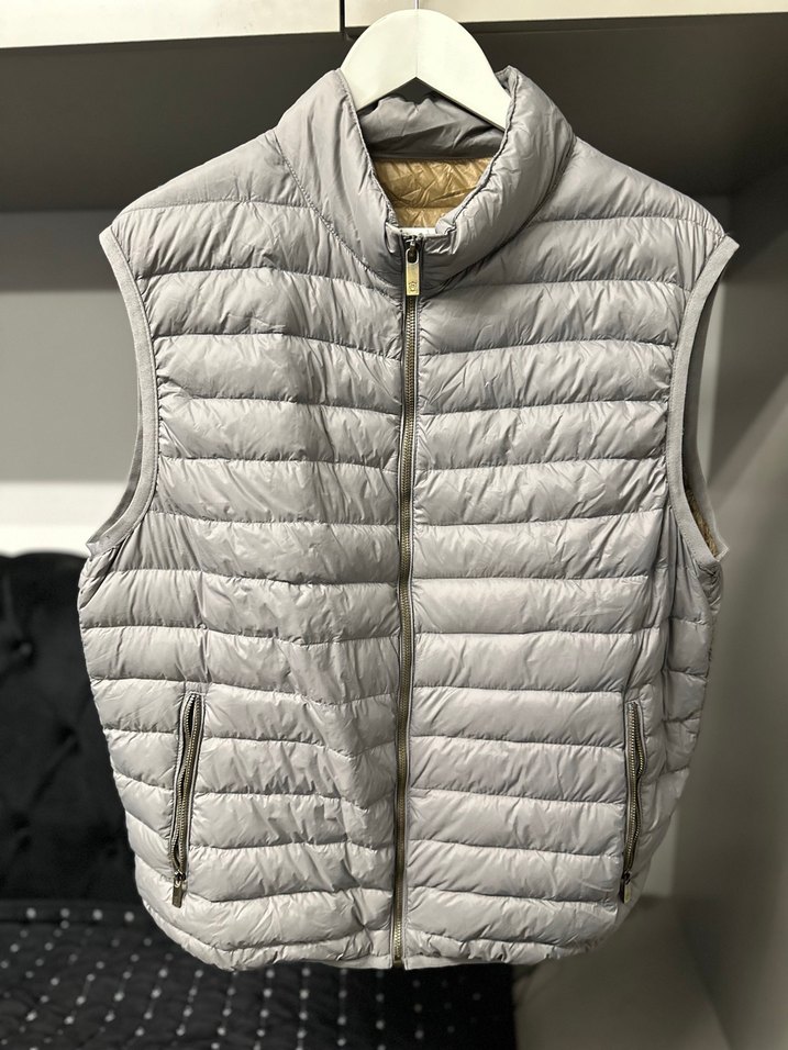 Massimo Dutti Gri renkte, fermuarlı cepli, yüksek yakalı ve sentetik kumaştan yapılmış, kolsuz erkek yelek. Normal boyda, dar kesim ve günlük rahat tarza uygun. İç dolgusu kaz tüyü.