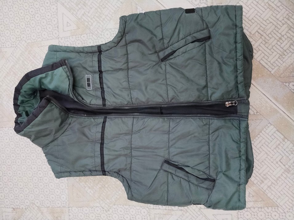Gri renkte, fermuarlı ve yüksek yakalı erkek yeleği. Sentetik kumaştan, kolsuz ve dar kesim, sokak stiline uygun.