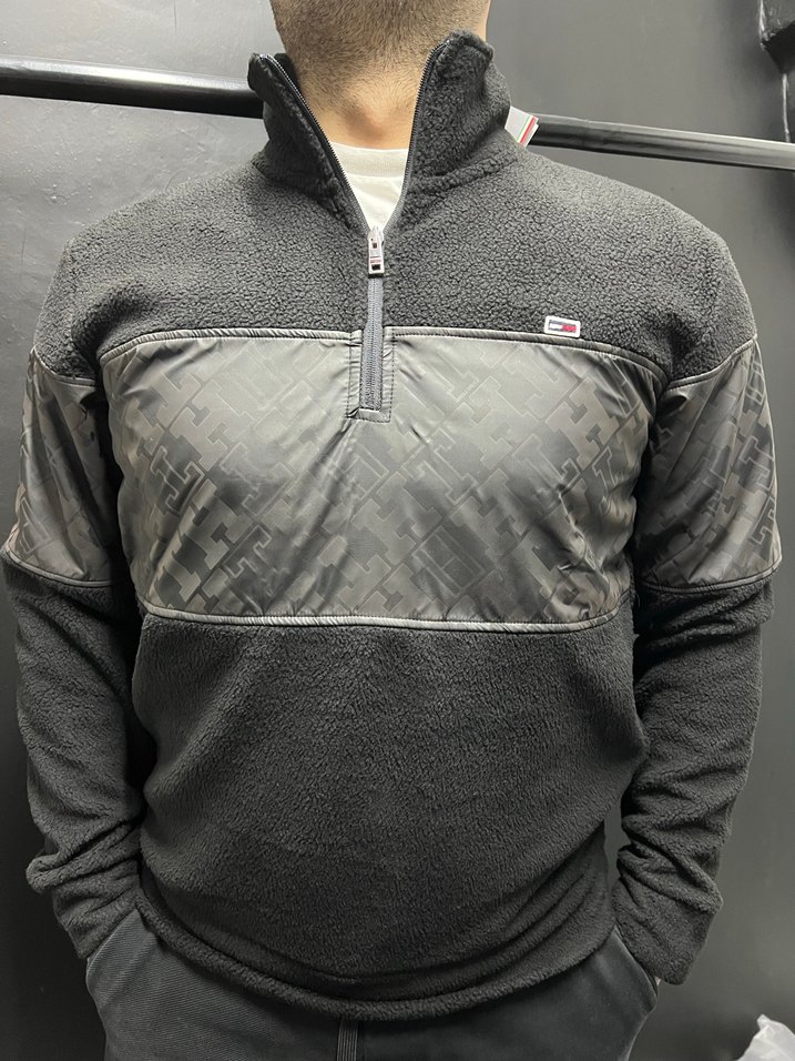 Gri renkte, yüksek yakalı fermuarlı erkek sweatshirt, uzun kollu ve bol kesimdir. Yumuşak ve sıcak kumaştan üretilmiş, göğüste desenli panel bulunur. L/xxl beden mevcut