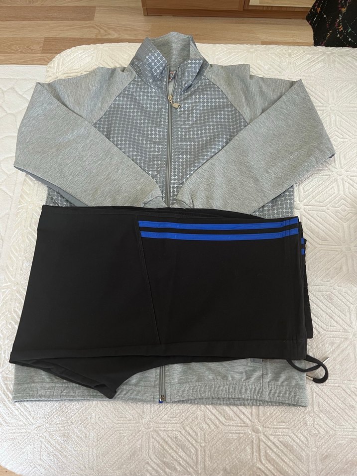 Gri renkte, fermuarlı, yüksek yakalı ve uzun kollu, kısa kesim eşofman takımı . Trendy ve rahat günlük kullanıma uygun.
