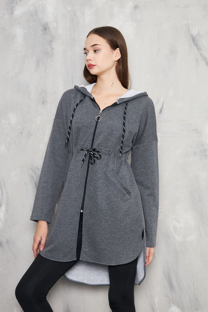 Gri renkli, fermuarlı, uzun kollu ve yuvarlak yakalı hamile sweatshirtü. Bel kısmında bağcıklı, rahat kesim ve yumuşak dokulu kumaştan üretilmiştir.