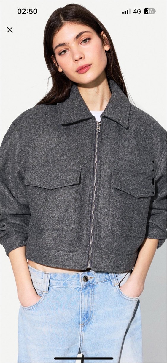 Gri renkli bomber ceket, notalı yakası ve fermuarlı ön kısmı ile dikkat çeker. Bol kesim, uzun kollu ve cep detaylıdır, yumuşak kumaştan üretilmiştir.