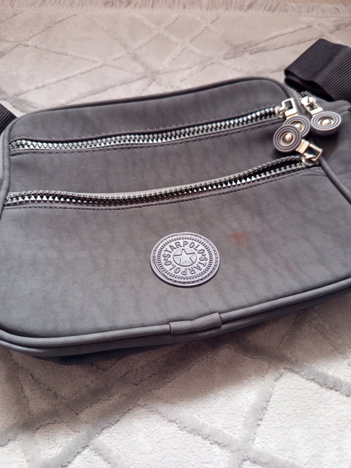 Gri renkli, sentetik kumaştan yapılmış, fermuarlı iki bölmeli kadın çapraz çanta. Günlük ve sokak stiline uygun, baskılı desene sahip.