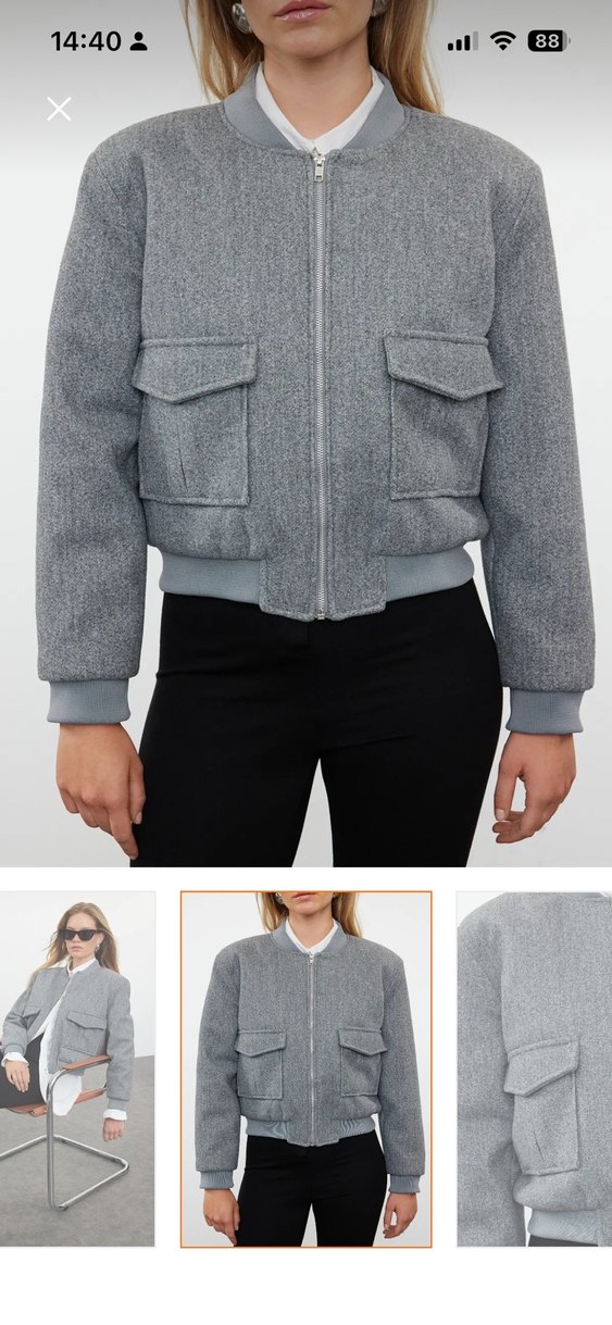 Fermuarlı ve cepli, yumuşak ve sıcak kumaştan yapılmış, kesimi dar, gri kadın ceket. Notlu yaka ve uzun kolludur. Tertemizdir
