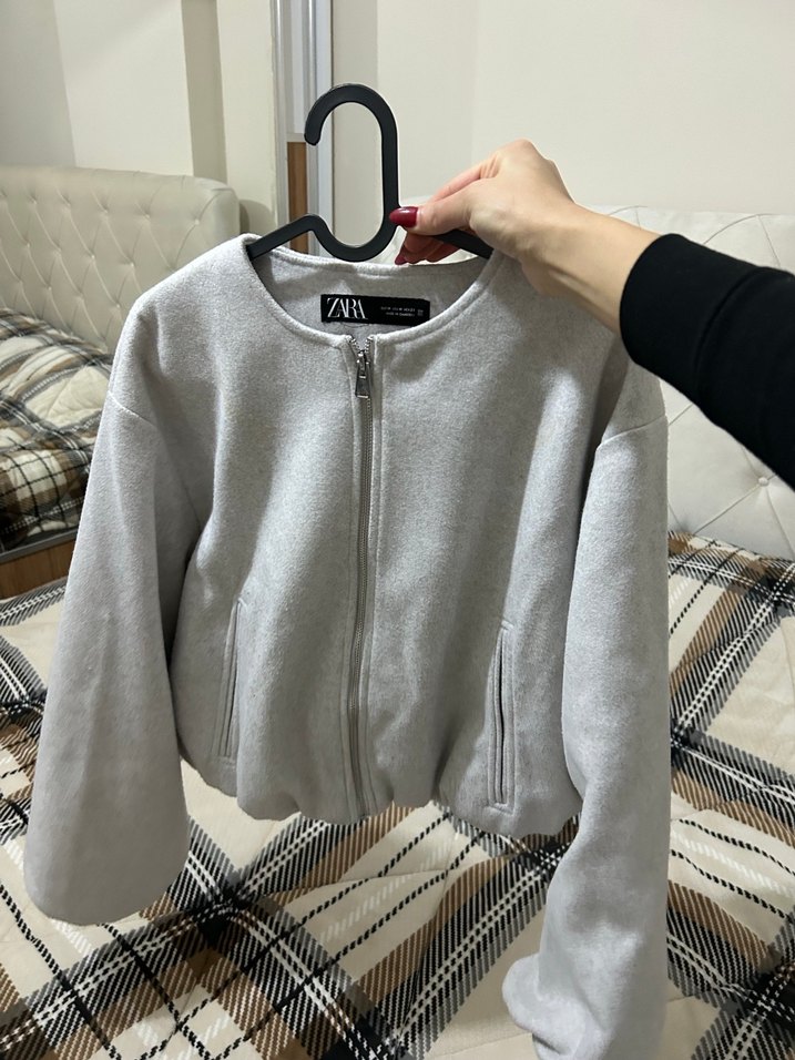 Gri, bol kesim kadın ceket fermuarlı ön ve uzun kolludur. Yumuşak ve sıcak kumaştan üretilmiş, bisiklet yaka ve midi boydadır. Marka: ZARA.