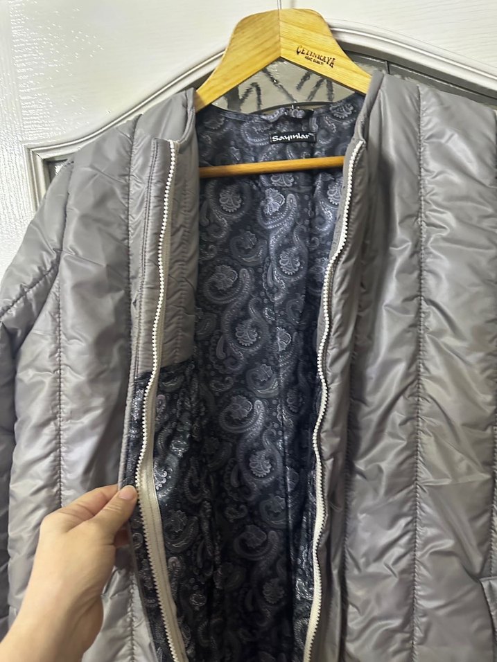 Fermuarlı önü ve uzun kollu, sentetik kumaştan yapılmış, gri renkli, desenli iç astarlı, dar kesim kadın kışlık şişme kaban .Rahat sokak stili için uygundur. ❄️