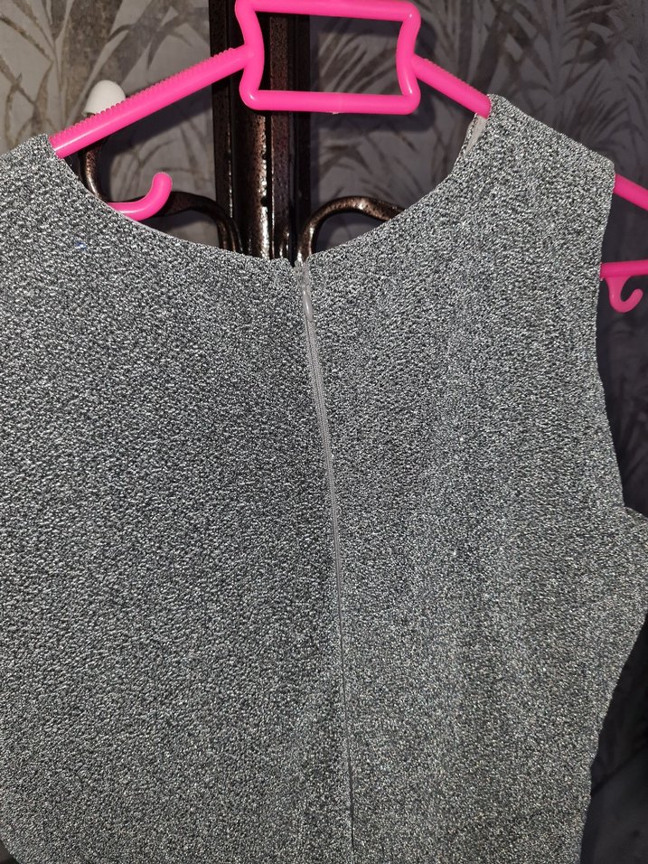 Kruvaze yakalı, fermuarlı, yumuşak sentetik kumaştan, kısa kesim, gri renkli, kadın kolsuz mini parlak abiye.