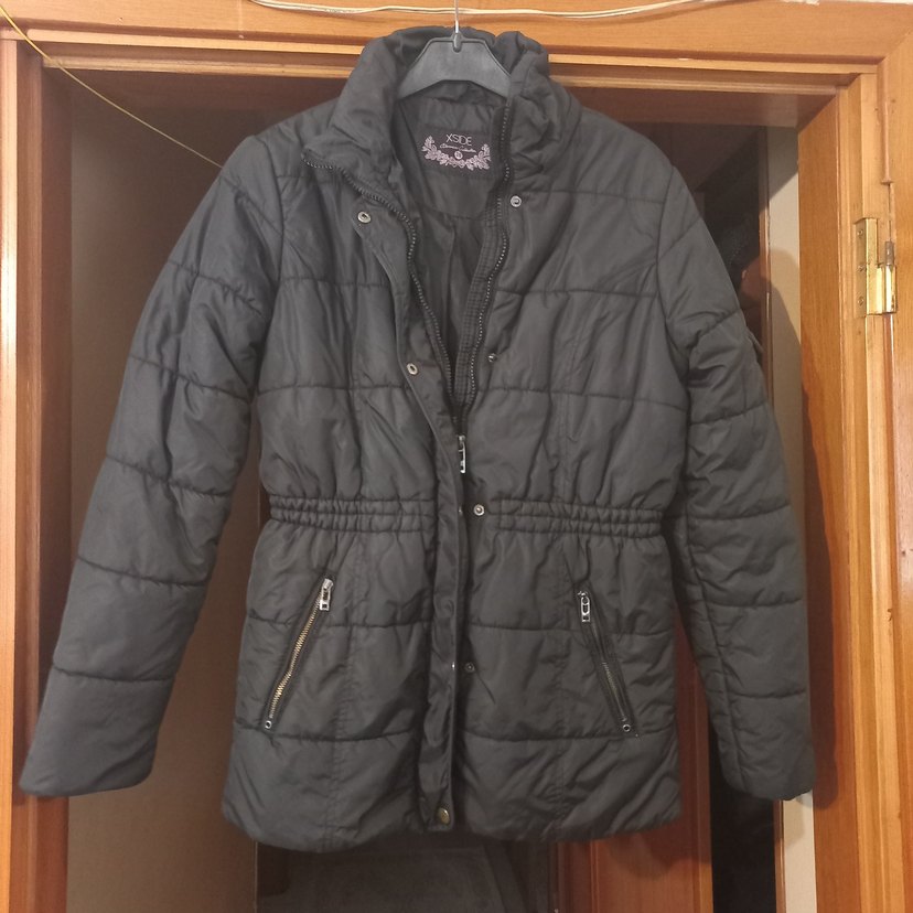 Gri, fermuarlı, uzun kollu, normal uzunlukta, notched lapel yaka özellikli, rahat ve sıcak kumaştan yapılmış kadın midi ceketi.