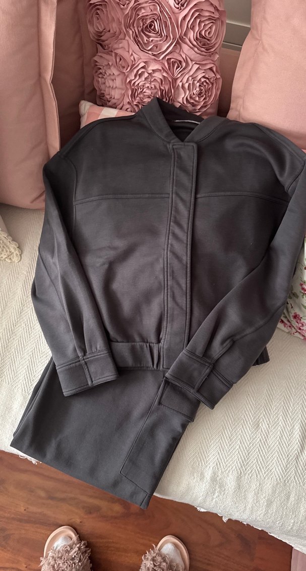 Kadınlar için gri renkte, fermuarlı, normal uzunlukta midi ceket ve pantolonu.Uzun kollu ve yumuşak, sıcak kumaştan yapılmıştır. Günlük kullanım için uygundur.