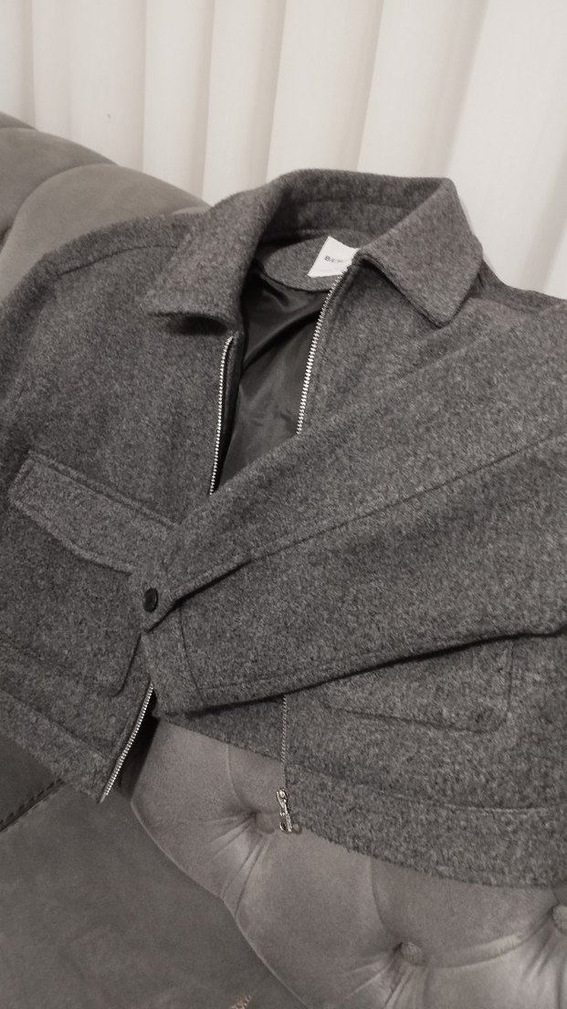 Gri renkte, fermuarlı ve kesik yakalı kadın kısa yün kaban. Regular fit, uzun kollu, midi boyda, günlük rahat kullanıma uygun minimalist stil.