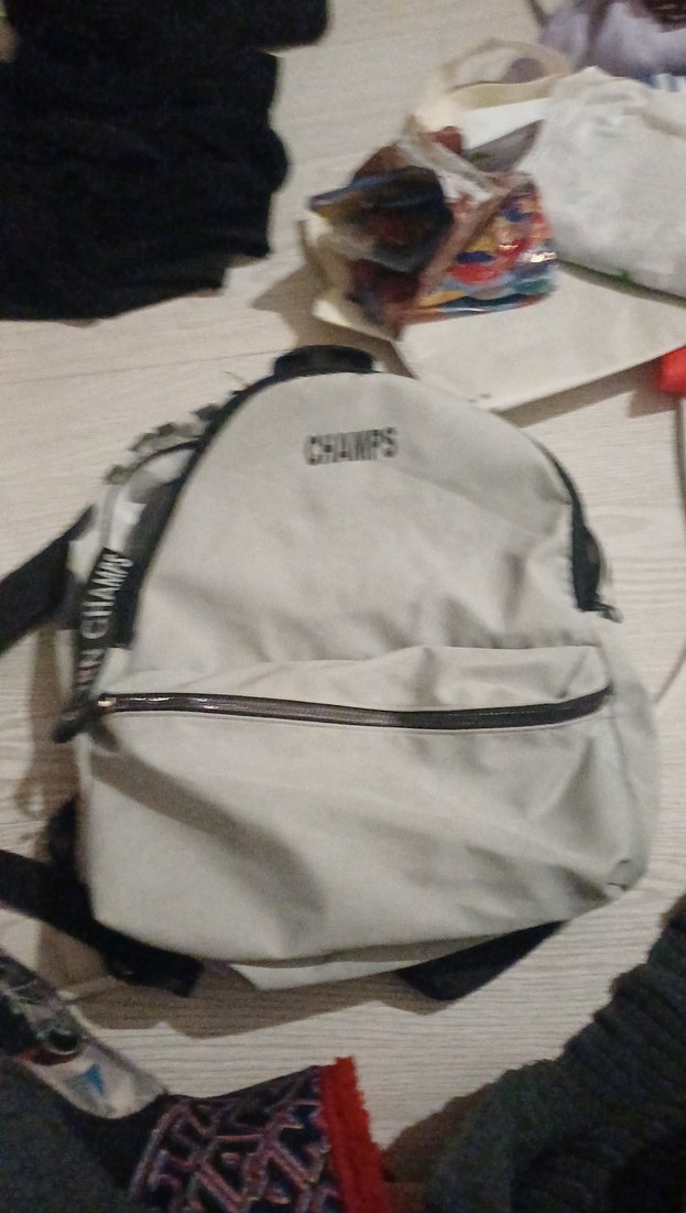 Gri renkli, yumuşak kumaştan fermuarlı sırt çantası. "CHAMPS" yazısı bulunur, günlük ve spor tarzlar için uygundur.