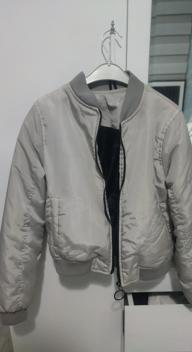 Gri fermuarlı, uzun kollu, bisiklet yaka ve dar kesim kadın ceket. Pürüzsüz sentetik kumaştan, günlük rahat sokak stili için uygundur. belde bitiyor