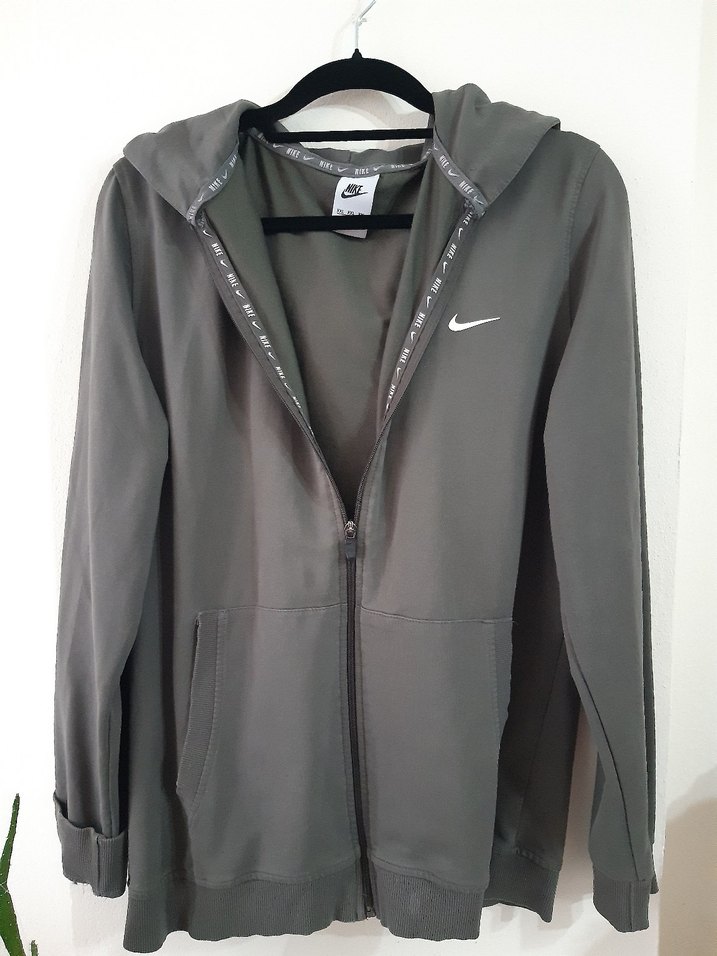 Gri renkte, fermuarlı ve uzun kollu kadın spor ceket. Yumuşak sentetik kumaştan, dar kesim ve çıtçıtlı yakaya sahip. Günlük kullanıma uygun, Nike logosu var.