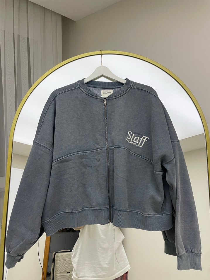 Gri denim kumaştan, fermuarlı, uzun kollu ve yuvarlak yaka kadın sweatshirt. Rahat kesimi ve 'Staff' baskısı ile günlük sokak stili için uygundur.