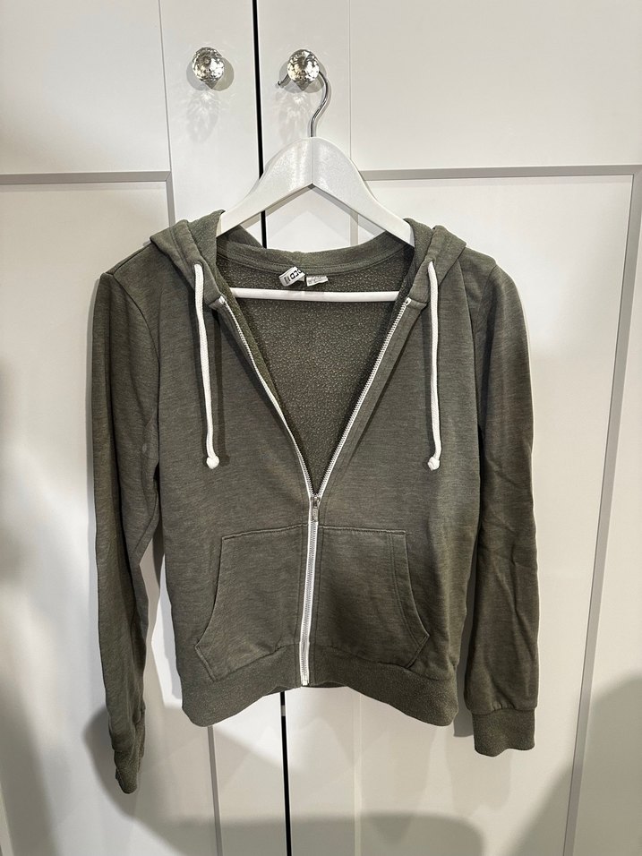 Gri, fermuarlı, kapüşonlu ve cepli kadın sweatshirt. Uzun kollu, normal boyda ve yumuşak, sıcak kumaştan üretilmiştir. Günlük sokak stili için uygundur.