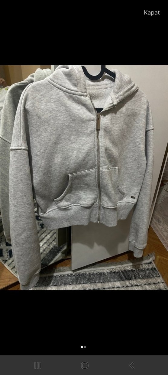 Gri renkli, fermuarlı, uzun kollu ve bol kesim kadın sweatshirtü. Rahat ve sıcak kumaştan, günlük rahat stil için uygundur.