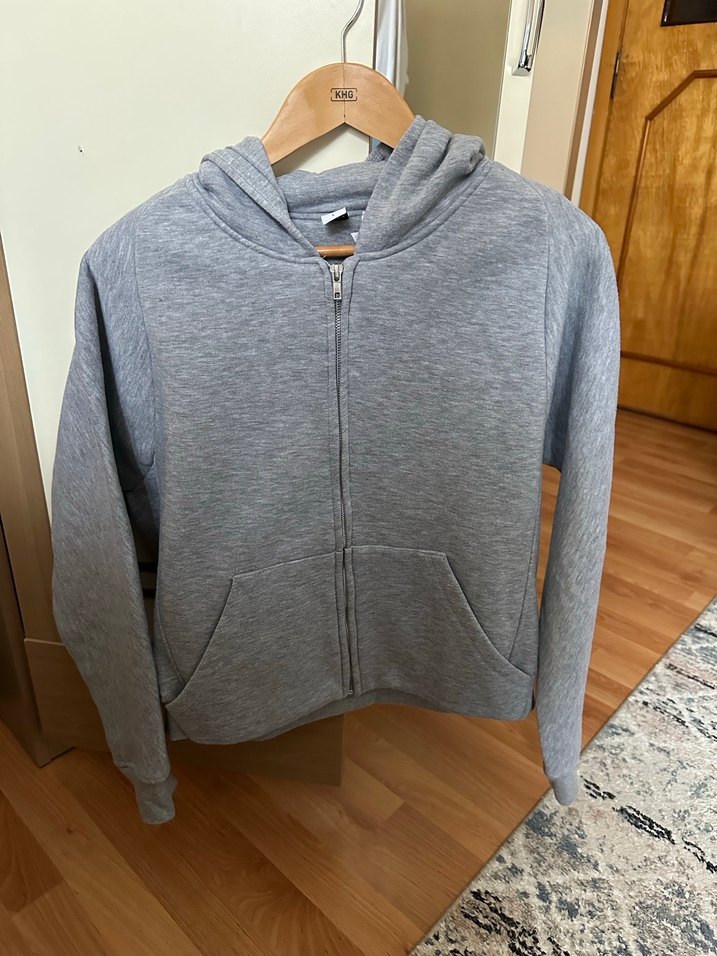 Kadınlar için gri fermuarlı sweatshirt, yuvarlak yaka ve uzun kollu. Rahat kesimi ve yumuşak, sıcak kumaşıyla günlük kullanıma uygun.