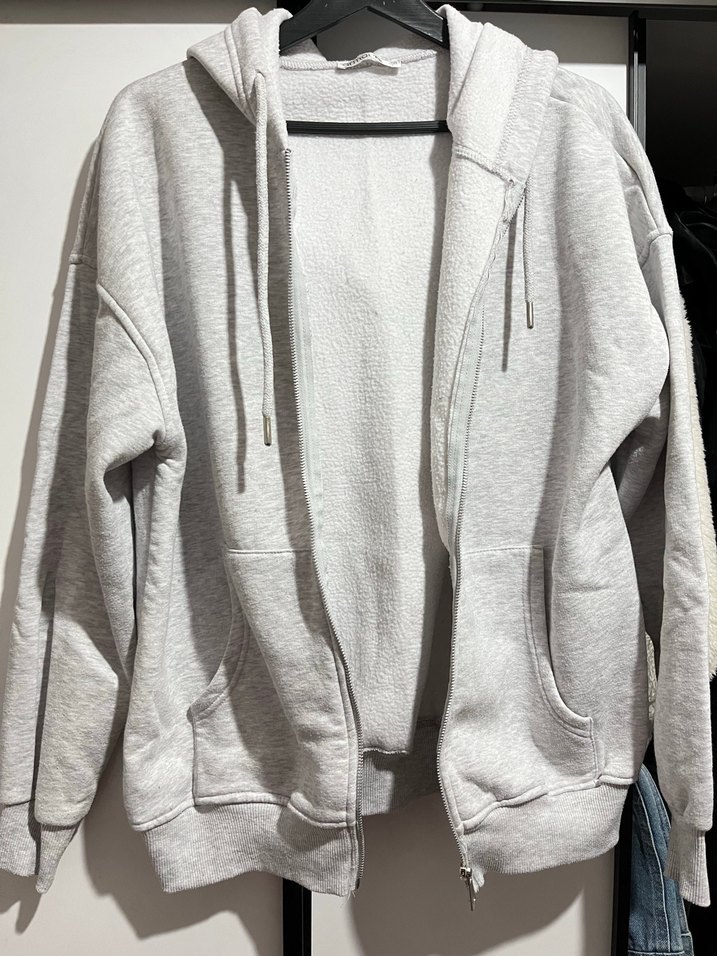 Gri renkli, fermuarlı, uzun kollu ve yuvarlak yakalı kadın sweatshirtü. Rahat kesimi ve yumuşak, sıcak kumaşı ile günlük kullanıma uygundur.