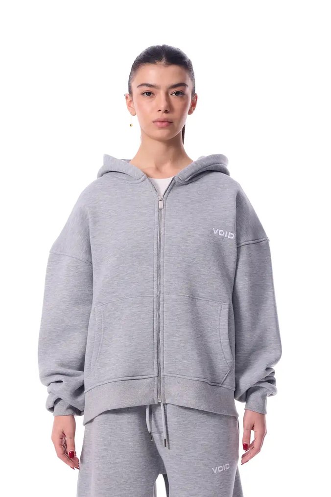 Yumuşak ve sıcak kumaştan, fermuarlı ve kapüşonlu gri bol kesim kadın sweatshirt, günlük rahat kullanım için cepli.