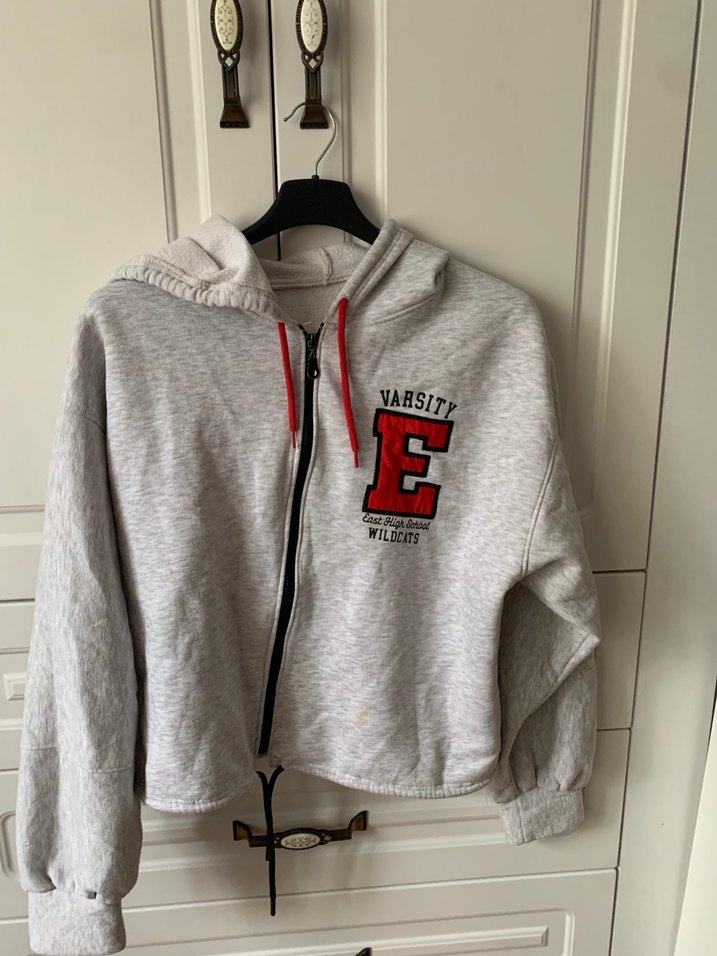 Gri renk, uzun kollu, kapüşonlu ve fermuarlı bol kesim sweatshirt.özel dikim terzide dikildi