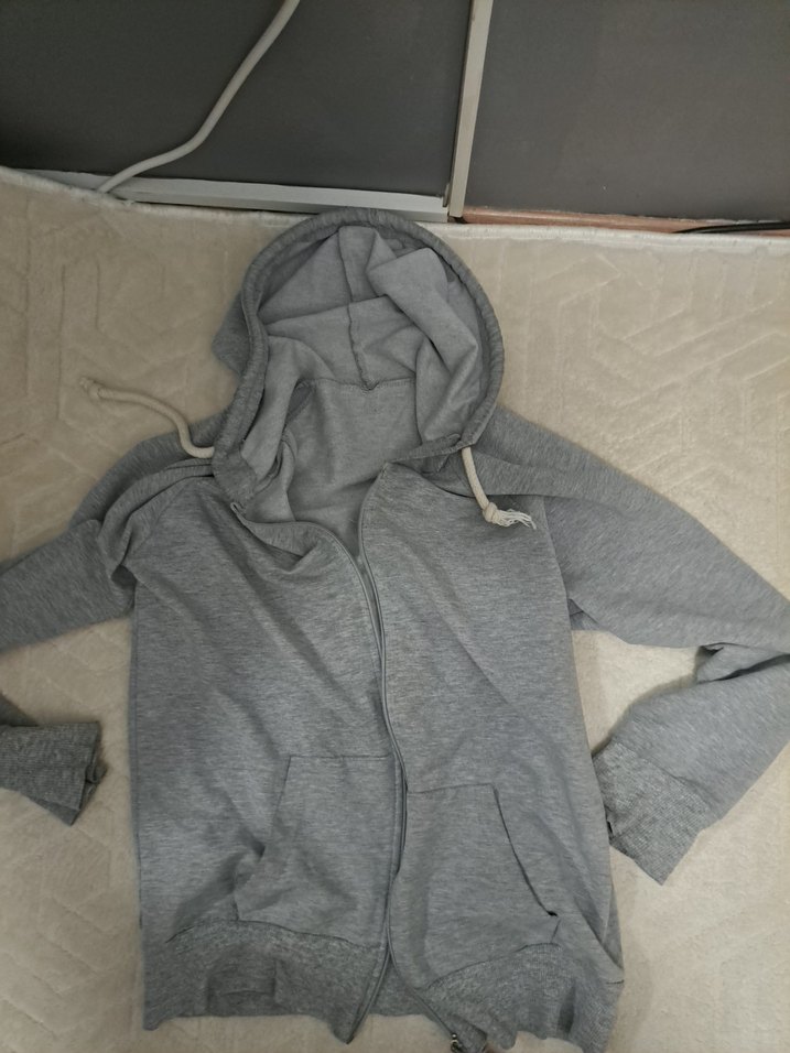 Gri renkli, fermuarlı ve kapüşonlu bu sweatshirt bol kesimdir. Uzun kollu ve midi boyda, rahat ve yumuşak dokuludur.