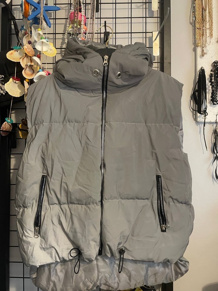Gri renk parlayan şişme yelek. Hiç kullanılmadı. L beden