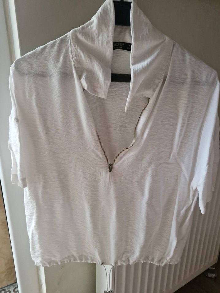 Gevşek kesim, yakalı ve kısa kollu kadın gömleği, yumuşak keten kumaştan yapılmış, açık gri renkte. Fermuar detayı ve normal midi boyda, rahat sokak stili için uygundur.