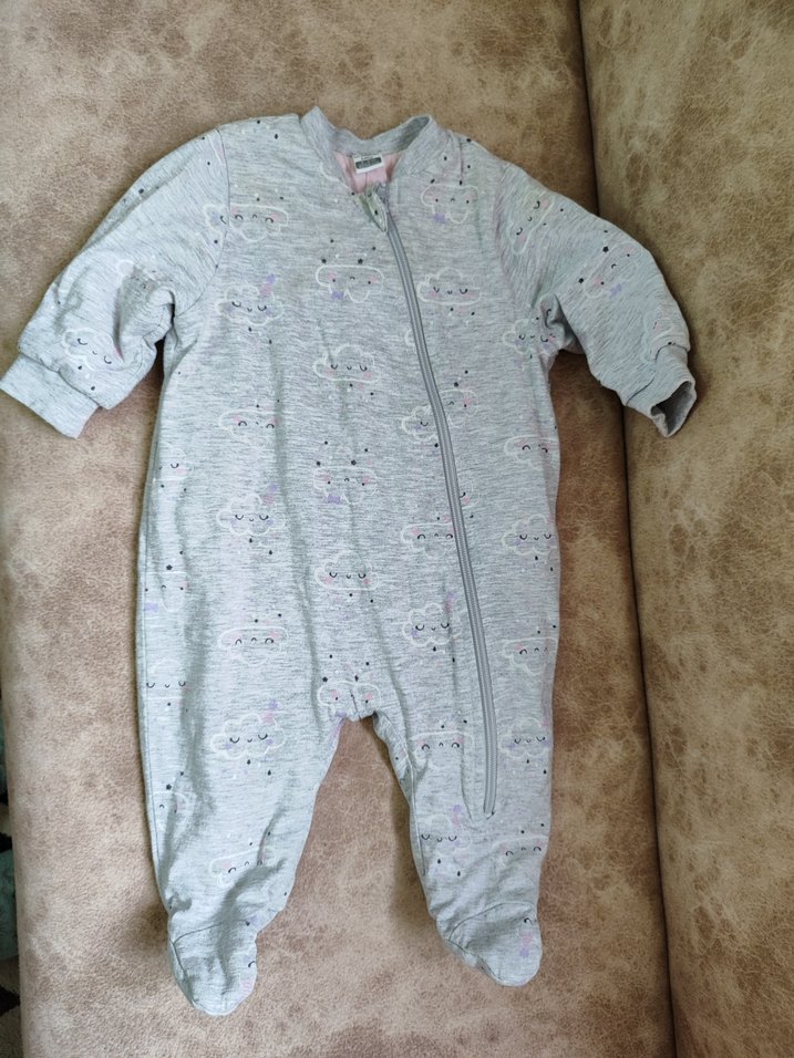 Gri renkli kız bebek tulumu, yuvarlak yakalı ve kolay giydirme için fermuarlı. Yumuşak, sıcak kumaş ve hafif bulut desenli. ️ Şapka hediye olarak vereceğim