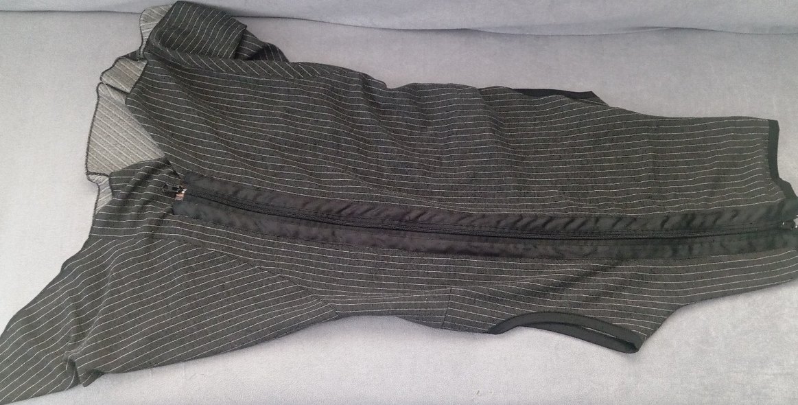 Gri, fermuarlı, kumaştan yapılmış, dar kesim kadın hırka . Midi boyda, ofis için uygun, şık ve sokak modasına uygun tarzda.