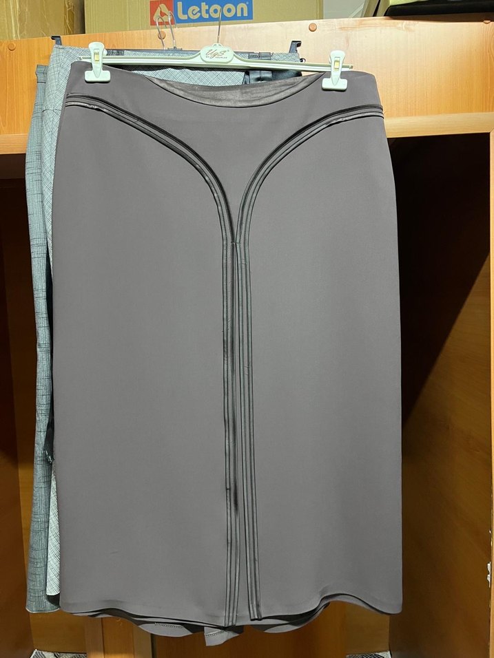 Fermuarlı detaylı, düz gri midi uzunlukta, sentetik kumaştan, iş ortamına uygun modern kesim kadın etek. Marka: ALetoon.