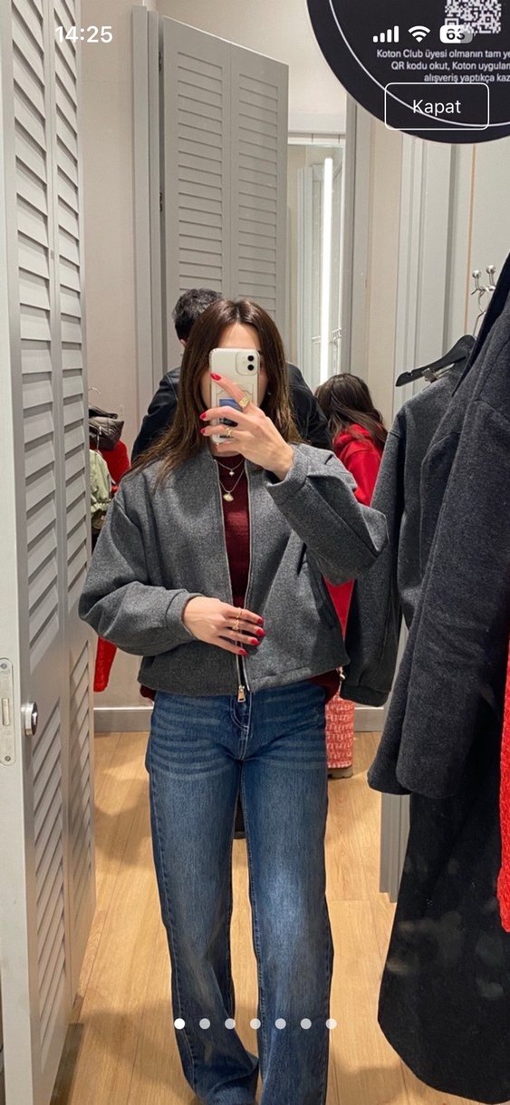 Gri renkte, fermuarlı önü ve yüksek yakası olan bol kesim midi kot ceket. Günlük kullanıma uygun rahat tarzda.