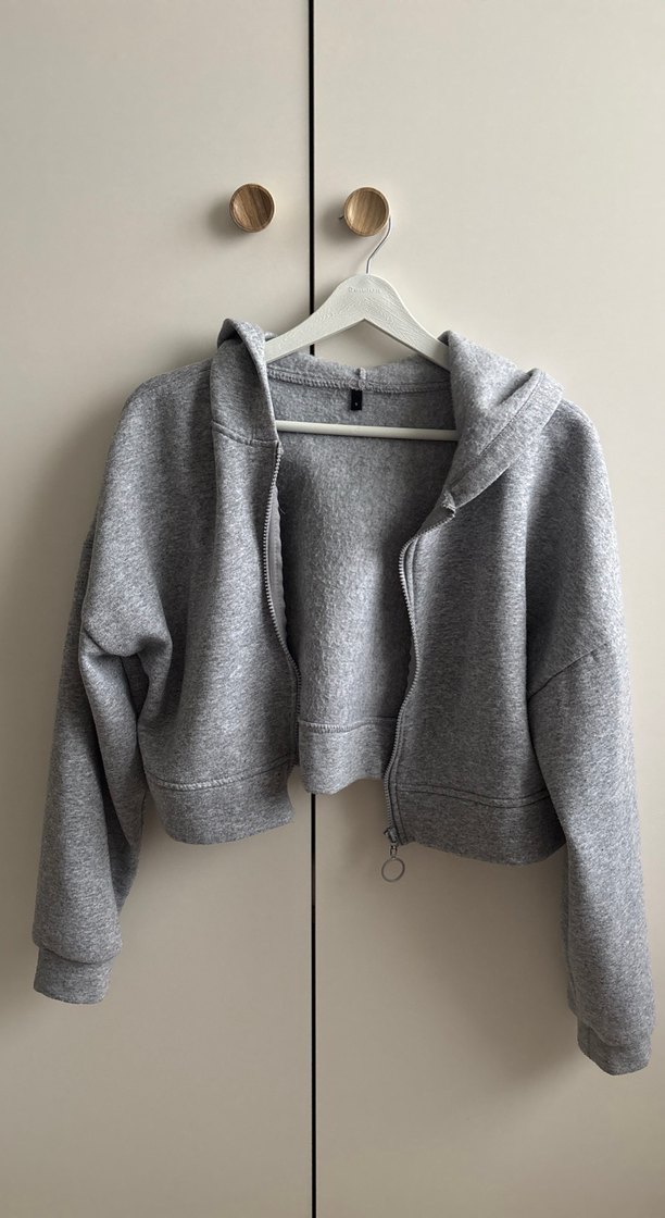 Gri renkli, fermuarlı, uzun kollu ve yuvarlak yakalı kadın sweatshirtü. Rahat kesimi ve midi boyu ile günlük sokak stiline uygundur.