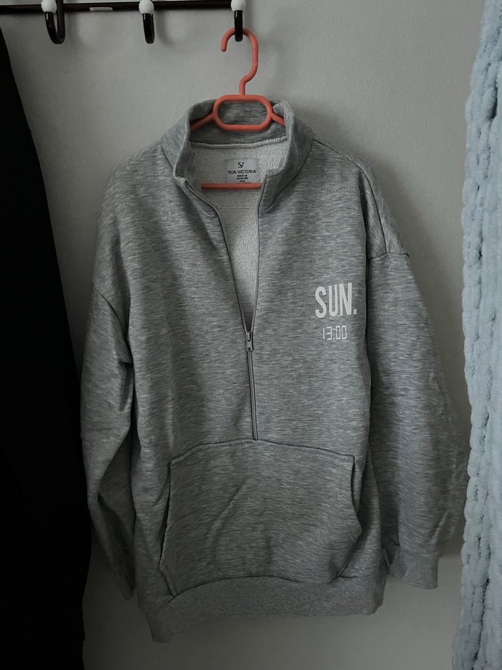 Gri renkli, uzun kollu, fermuarlı sweatshirt. Yumuşak kumaştan ve bol kesim, günlük rahat şıklık sunar.