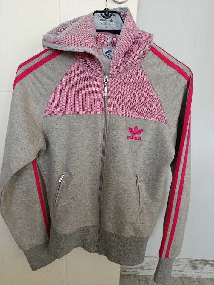 Gri, uzun kollu ve fermuarlı kız Sweatshirt. Crew neck kesimi ve yumuşak fleece kumaşı var, pembe şeritler ve Adidas logosu ile detaylandırılmış. Trendy ve rahat bir model. koltuk altı ölçüsü 50 cm boy 62 cm hiç kullanılmadı ama kolunda sarı bir leke var