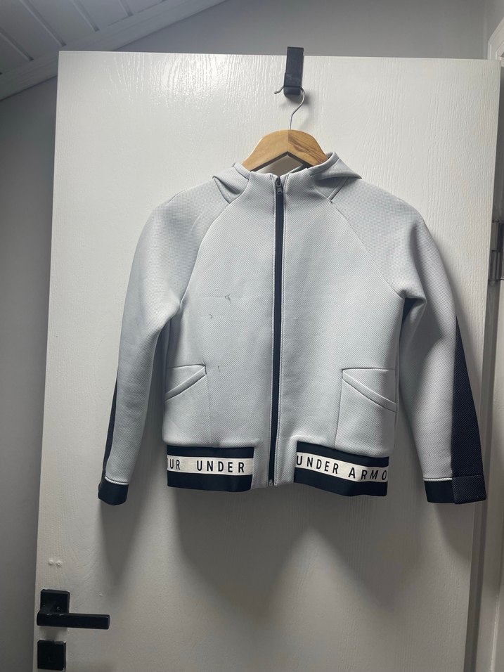 Bazı yerlerde iplik çekilmesi var. Uzun kollu, yüksek yakalı, fermuarlı gri sweatshirt. Yumuşak kumaştan, cepli ve Under Armour markalı detaylara sahip.