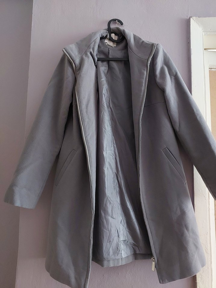Gri uzun kaban, ön fermuar ve yan ceplerle basit ve kullanışlı bir tasarıma sahiptir. bir iki kez kulanıldı. temiz sorunsuzdur.