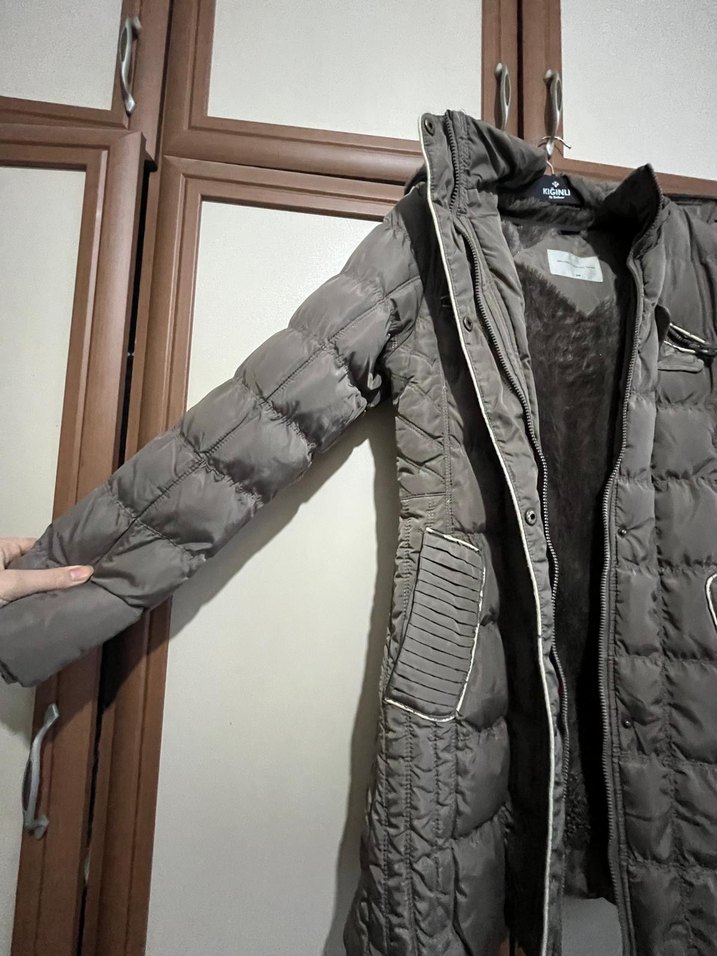 Fermuarlı, uzun boylu ve çıkmalı yaka detaylı gri kadın kış montu, sentetik kumaştan, sokak stiline uygun ve günlük kullanıma elverişli.