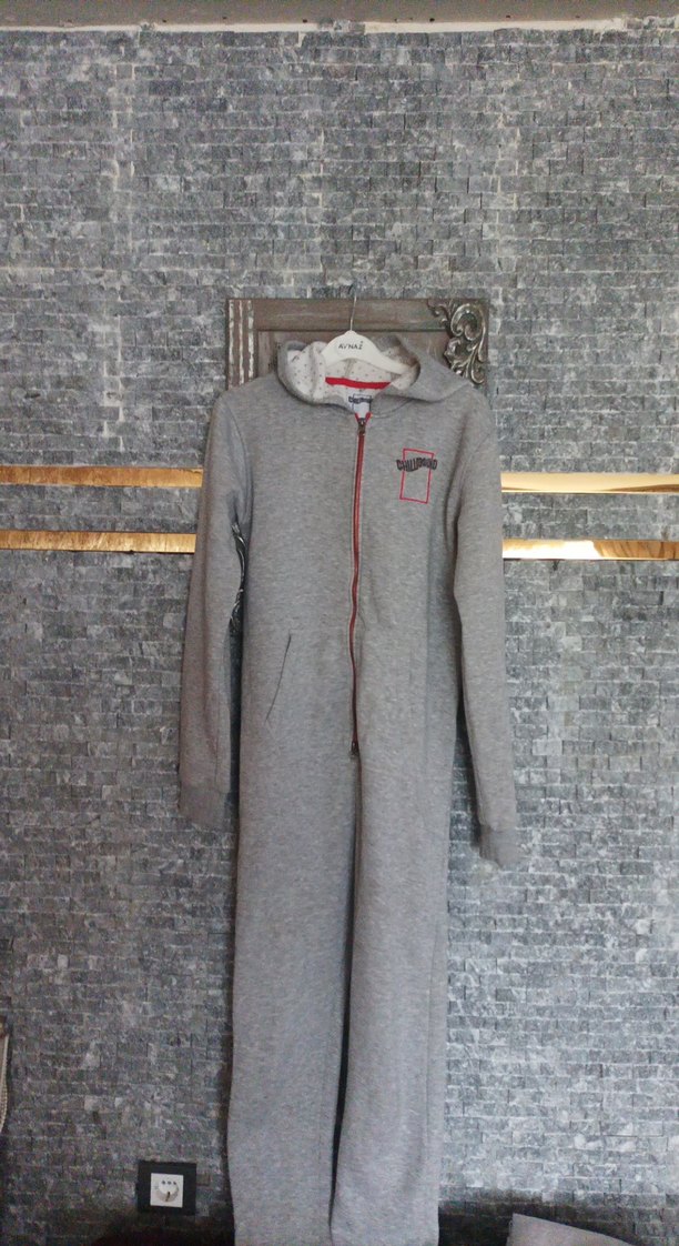 Gri renk, fermuarlı ön kısmı ve uzun kollu, yumuşak ve rahat kumaştan yapılmış, oturan kesimli hamile tulumu. Notlu yaka detayı ile günlük sokak stili sunar.
