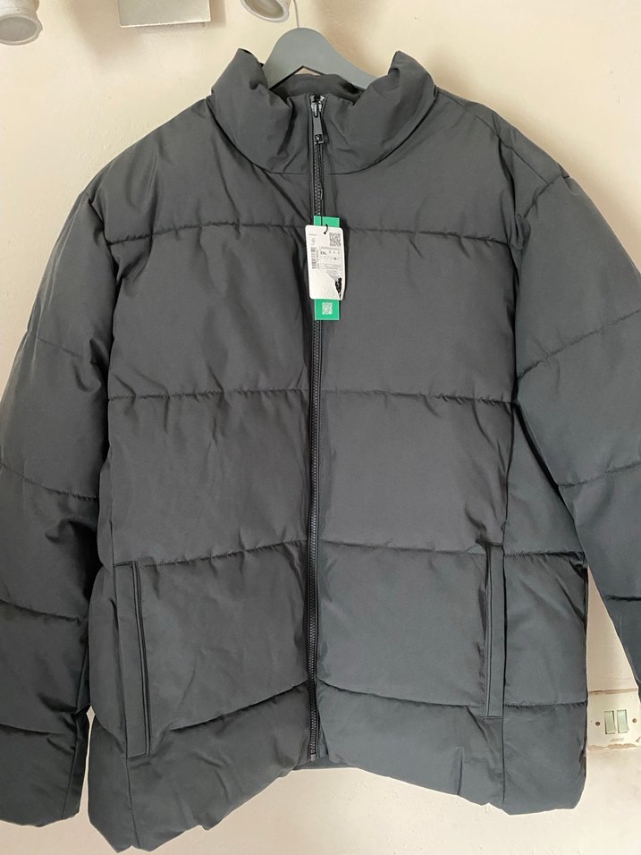 Gri renkte, yüksek yakalı ve fermuarlı erkek mont ürün sıfır etiketli üründür