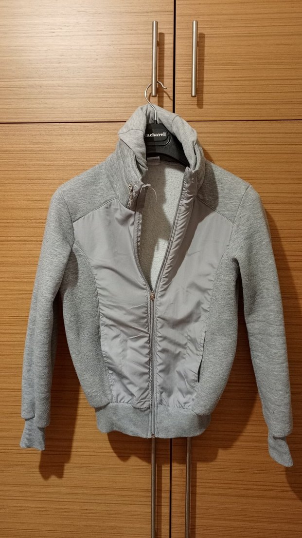 Gri renkte, yüksek yakalı ve fermuarlı kadın ceketi.kapsonu fermuarlı gizlenebiliyor. içi sardonlu. temiz kullanılmıştir.