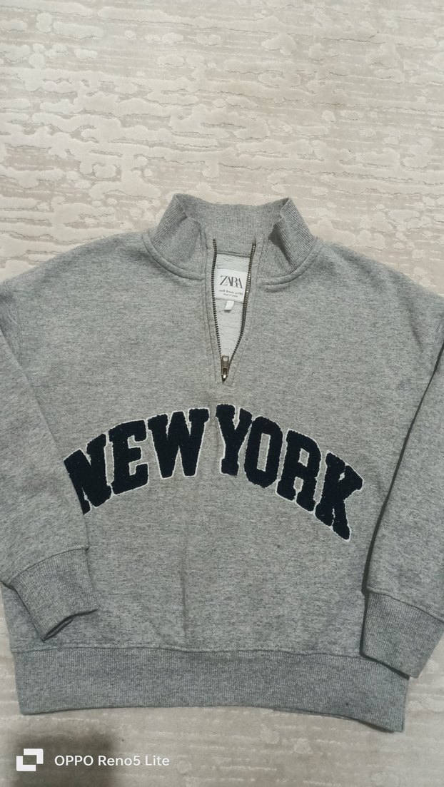Gri, yumuşak kumaştan, fermuarlı ve yüksek yakalı bol kesim sweatshirt. Uzun kollu ve önünde "NEWYORK" baskılı, Zara marka az giyinmiş olup iyi durumdadır