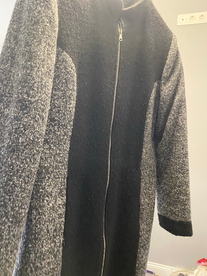 Yün kumaştan yapılmış, uzun kesimli ve fermuarlı gri kabanı. Uzun kollu, kesimi oturan ve ofis kullanımı için uygun, rahat ve şık bir model.