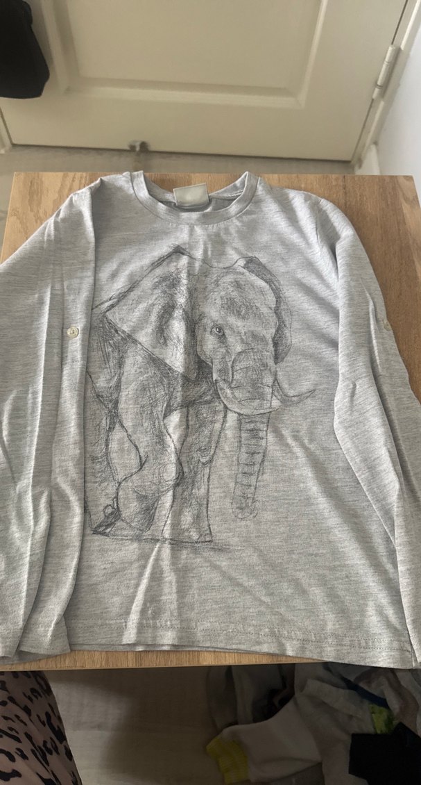 Gri renkli, uzun kollu, yuvarlak yakalı hamile tişörtü. Fil baskılı ve düğmeli detaylara sahip, rahat kesim ve yumuşak keten kumaştan yapılmıştır.