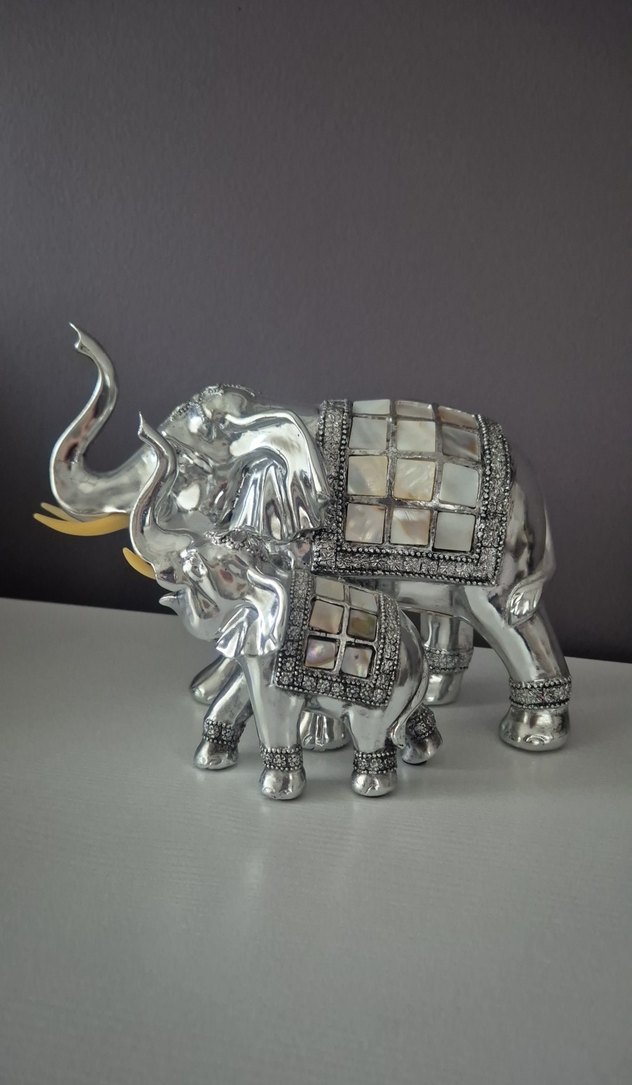 Anne ve çocuk, gri fil obje, sedef işlemeli, ve parlak yüzeyle dekorasyona şıklık katıyor.